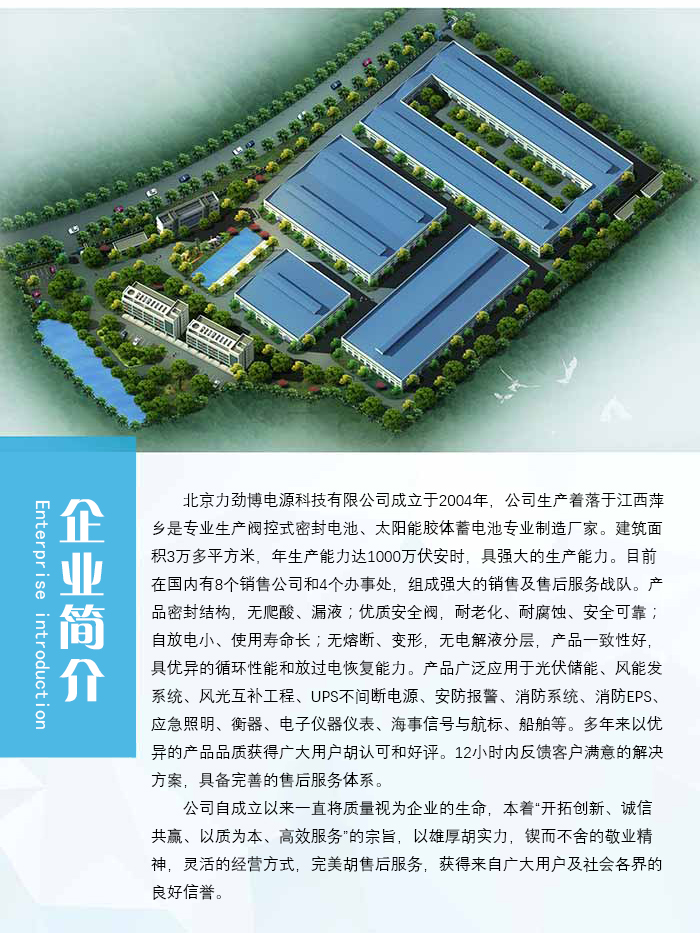 北京力劲博电源科技有限公司成立于2004年,公司生产着落于江西萍乡是专业生产阀控式密封电池、太阳能胶体蓄电池专业制造厂家。建筑面积3万多平方米,年生产能力达1000万伏安时,具强大的生产能力。